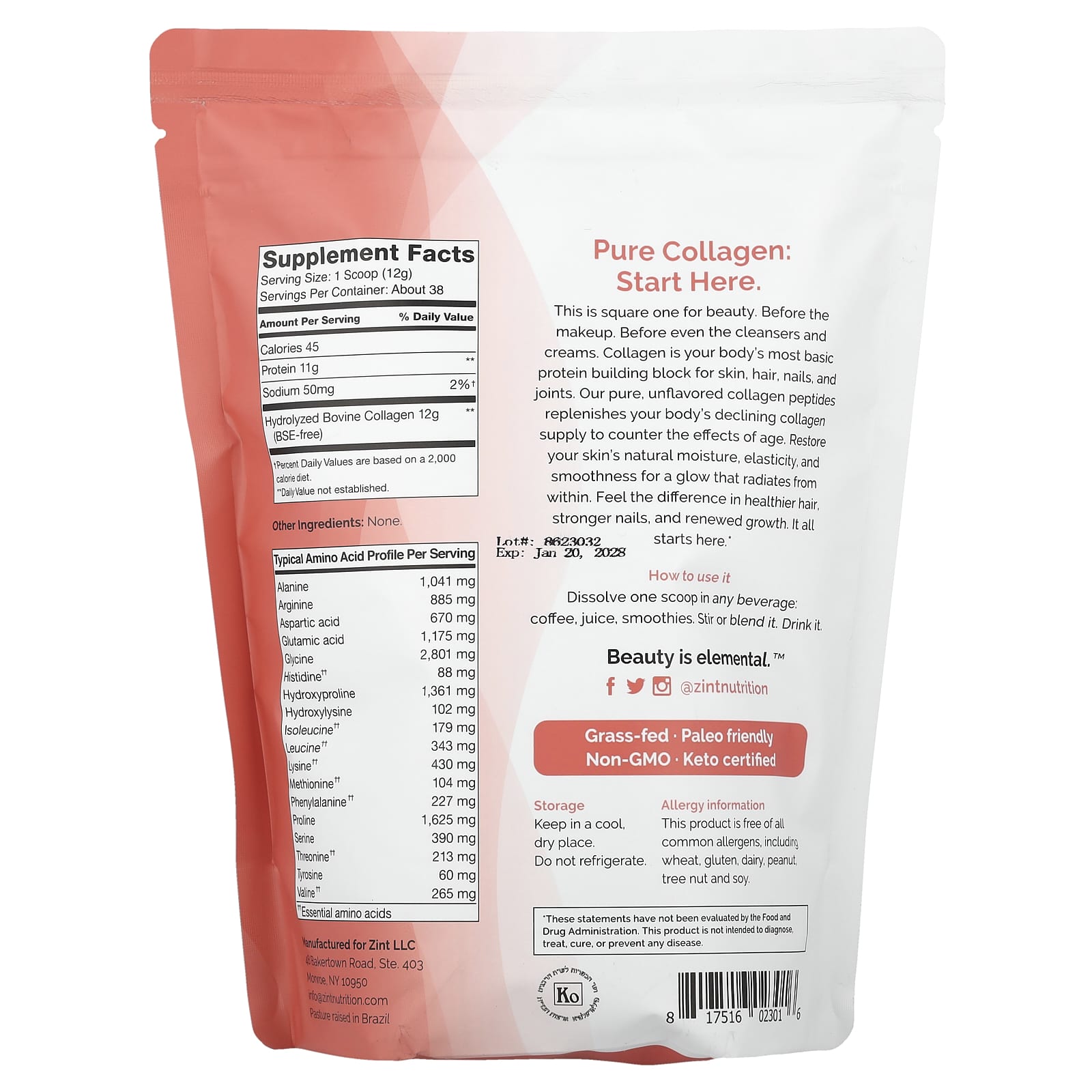 Zint Peptídeos de Colágeno Puro de Gado Criado no Pasto Sem Sabor Saco 454 g (16 oz) – Zint Suplementos Ossos, Articulações e Cartilagem Colágeno, Suplementos Nutrição Esportiva Proteína Proteína Animal Proteína De Carne.