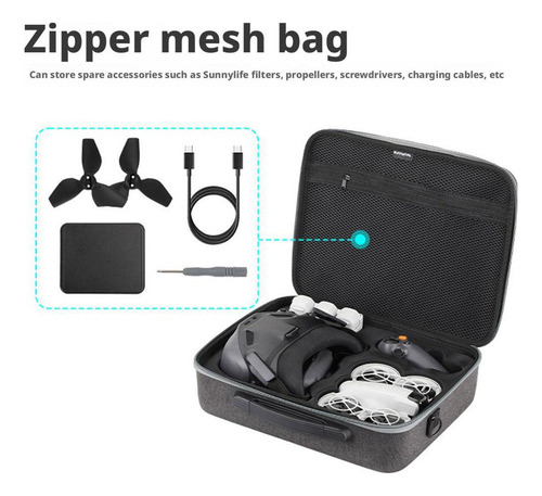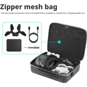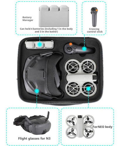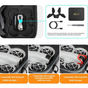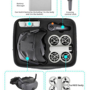 O pacote pode armazenar Neo Body, Battery Butler, 4 baterias (incluindo 1 no corpo e 3 no mordomo), Cross Control Stick 3, Flight Goggles N3, bem como filtros Sunnylife, hélices de reposição, chaves de fenda, cabos de carregamento e outros acessórios.